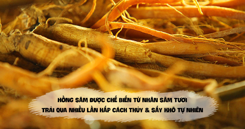 Nhân sâm đủ 6 năm tuổi sau khi qua nhiều công đoạn xử lý như cắt bỏ rễ phụ, hấp, sấy để đạt được tỷ lệ nước dưới 14% mới thu được hồng sâm thành phẩm. Hồng sâm không chỉ lành tính mà còn nhiều dưỡng chất hơn so với nhân sâm thông thường, rất tốt cho sức khỏe.